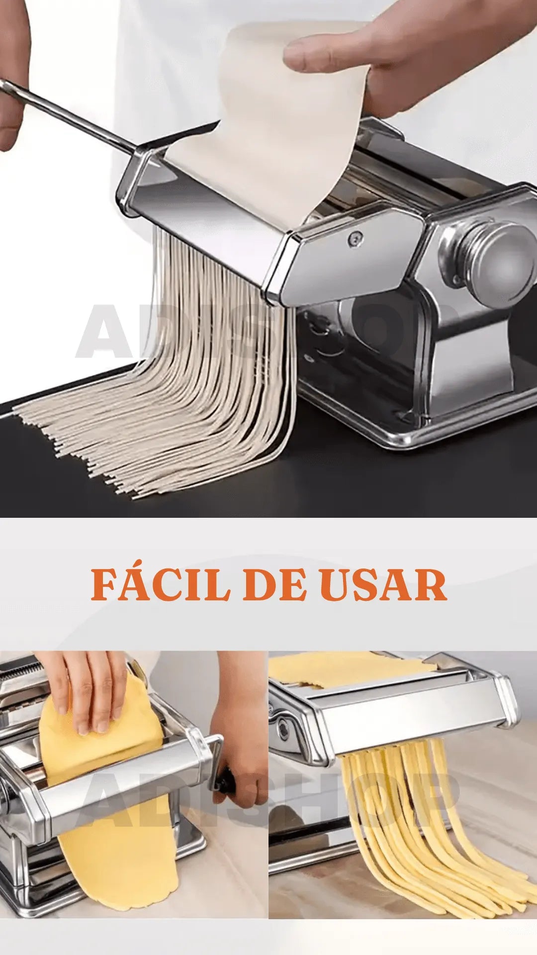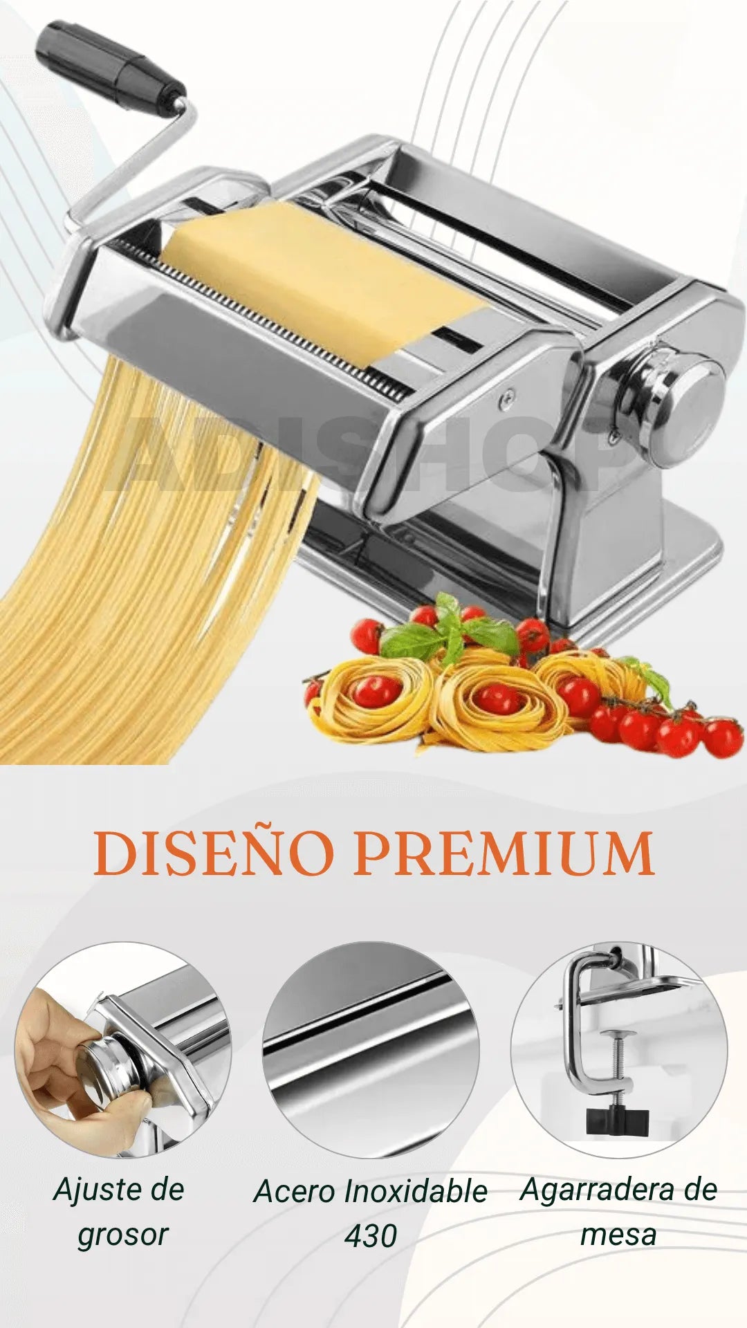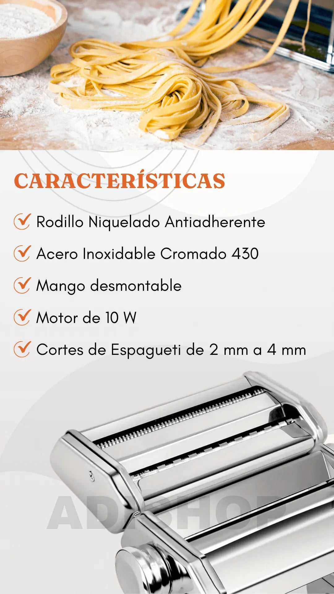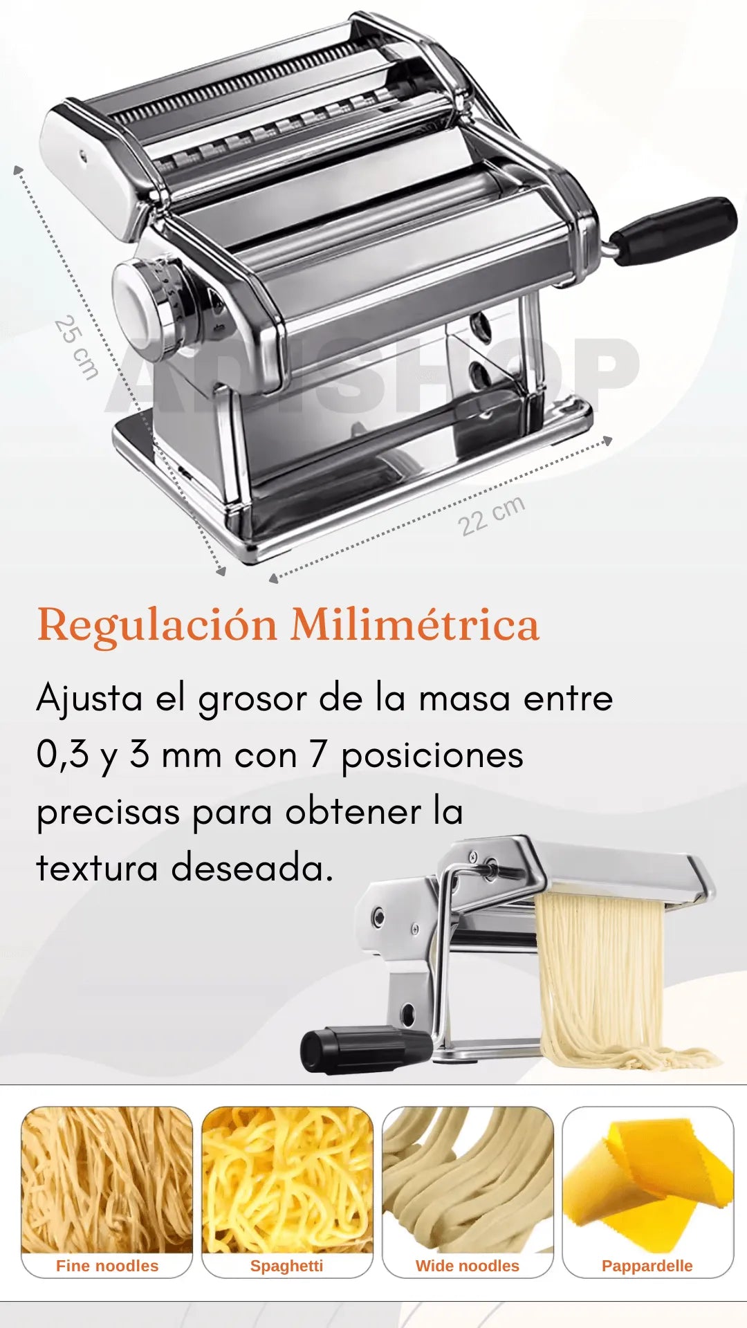 La mayoría de máquinas manuales económicas están fabricadas en aluminio o plástico, lo que limita su durabilidad y precisión. En cambio, esta máquina cuenta con rodillos niquelados de acero de alto carbono, un sistema de ajuste de grosor de 0,3 a 3 mm con 7 niveles, y dos tamaños de corte (2 mm y 4 mm). Esto significa que obtendrás resultados profesionales con una textura uniforme, sin que la masa se pegue o se deforme.